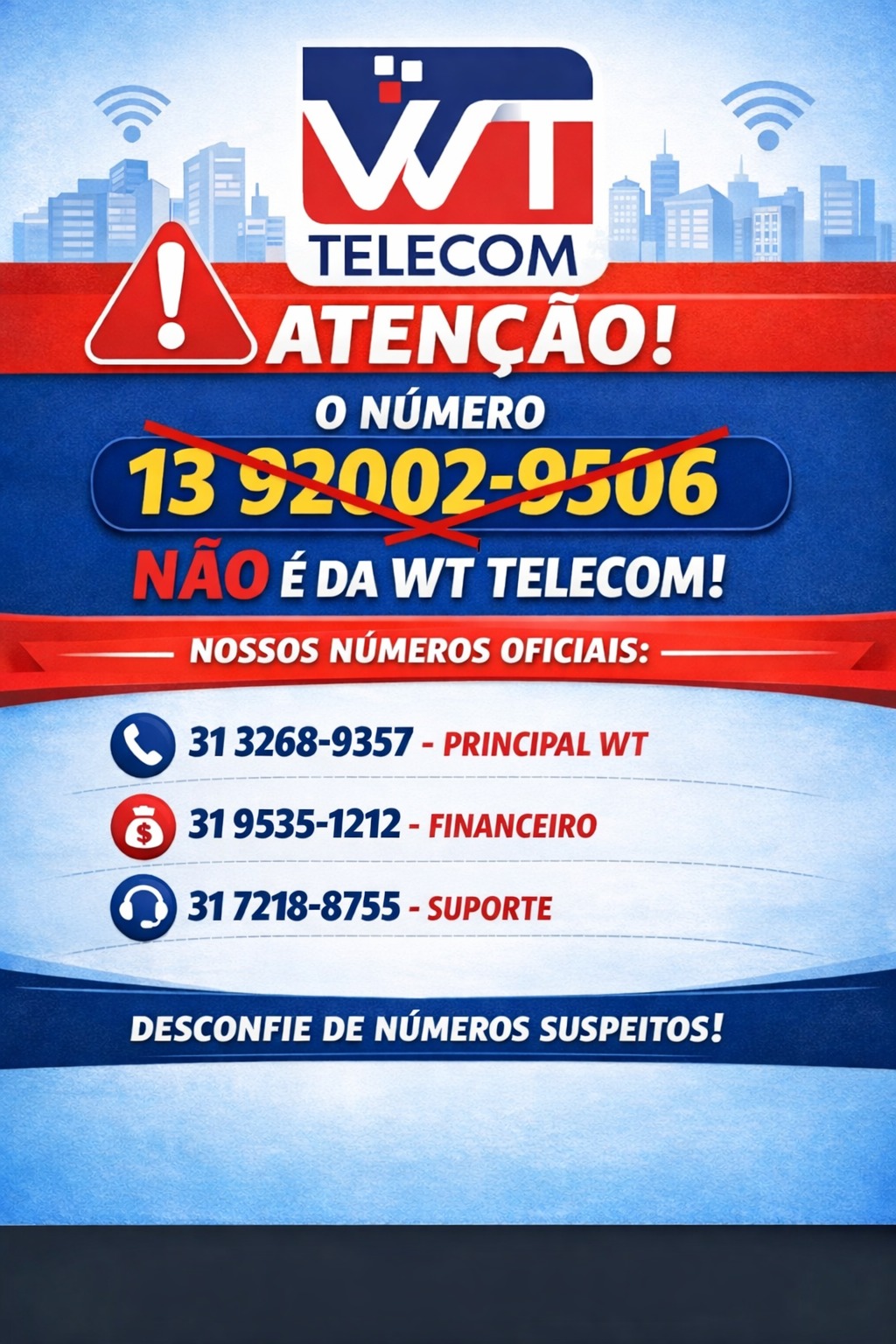 Informamos a todos os nossos clientes que o número (13) 92002-9506 NÃO pertence à WT Telecom. Este número está sendo utilizado indevidamente em tentativas de fraude.